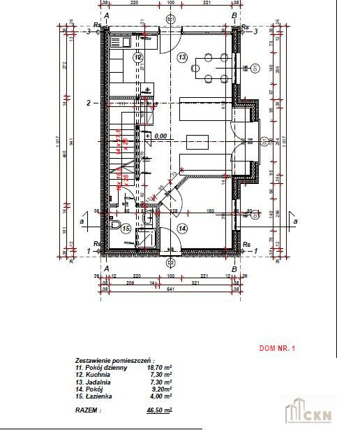 PIĘTRO - pokój dzienny, kuchnia, jadalnia, pokój, łazienka - razem 46, 5 m2;